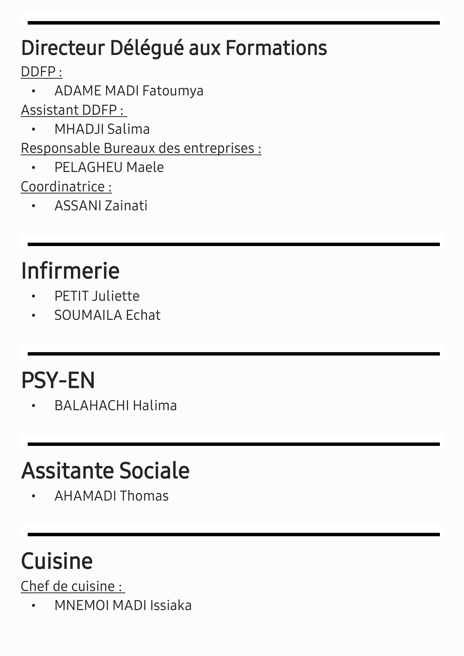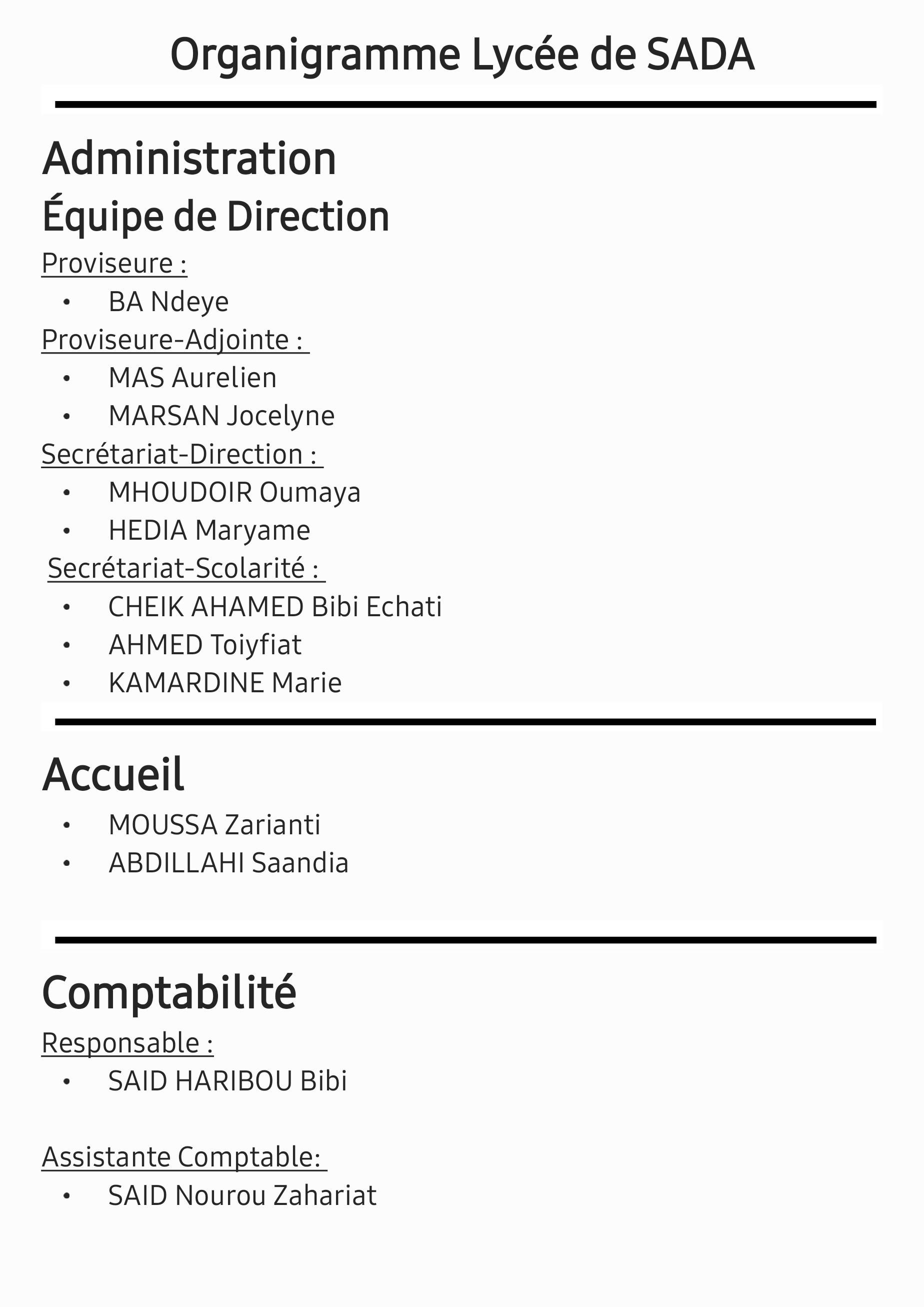 - Secrétariat-Scolarité : CHEIK AHAMED Bibi Echati, AHMED Toiyfiat, KAMARDINE Marie
