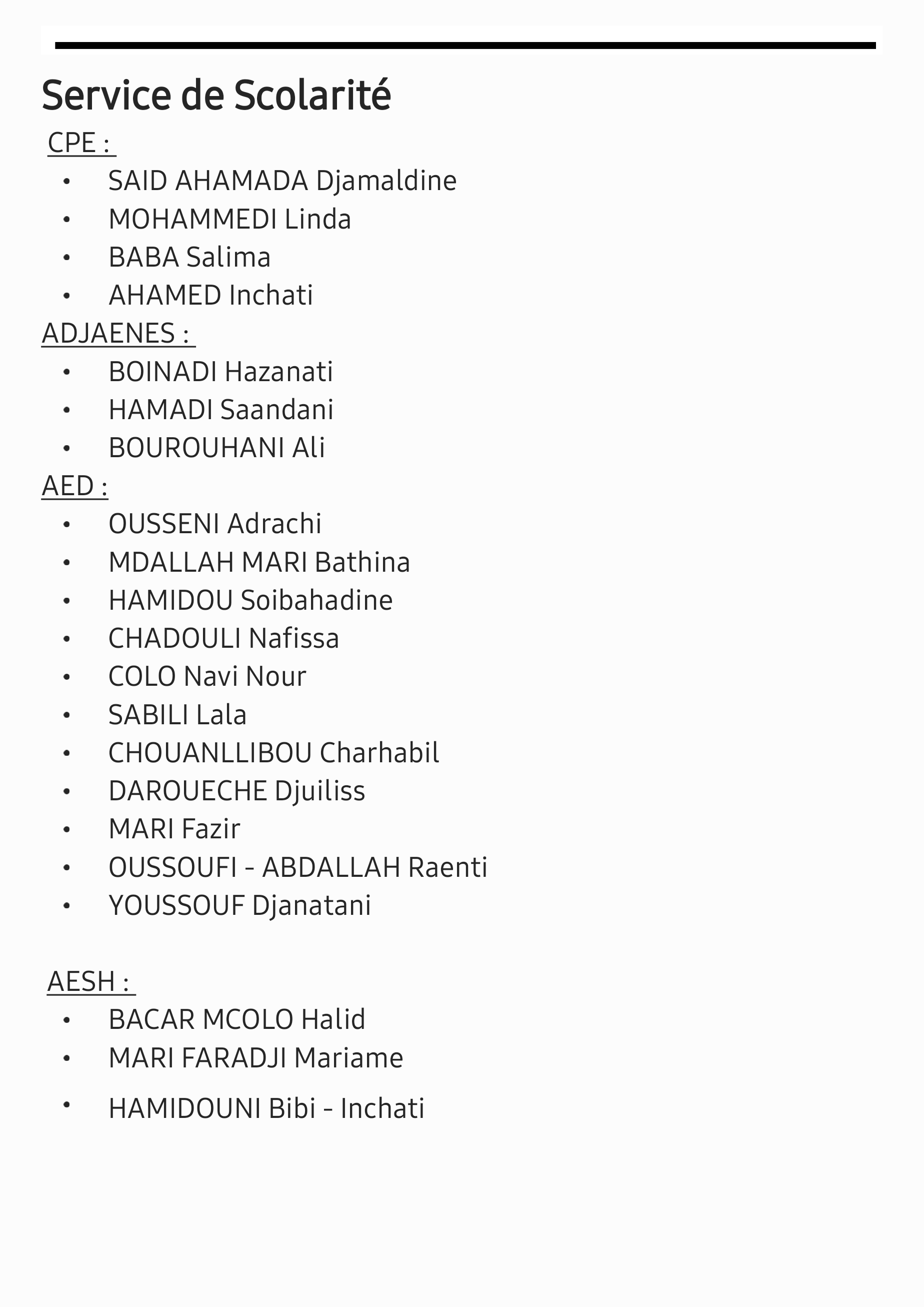 - AESH : BACAR MCOLO Halid, MARI FARADJI Mariame, HAMIDOUNI Bibi-Inchati
