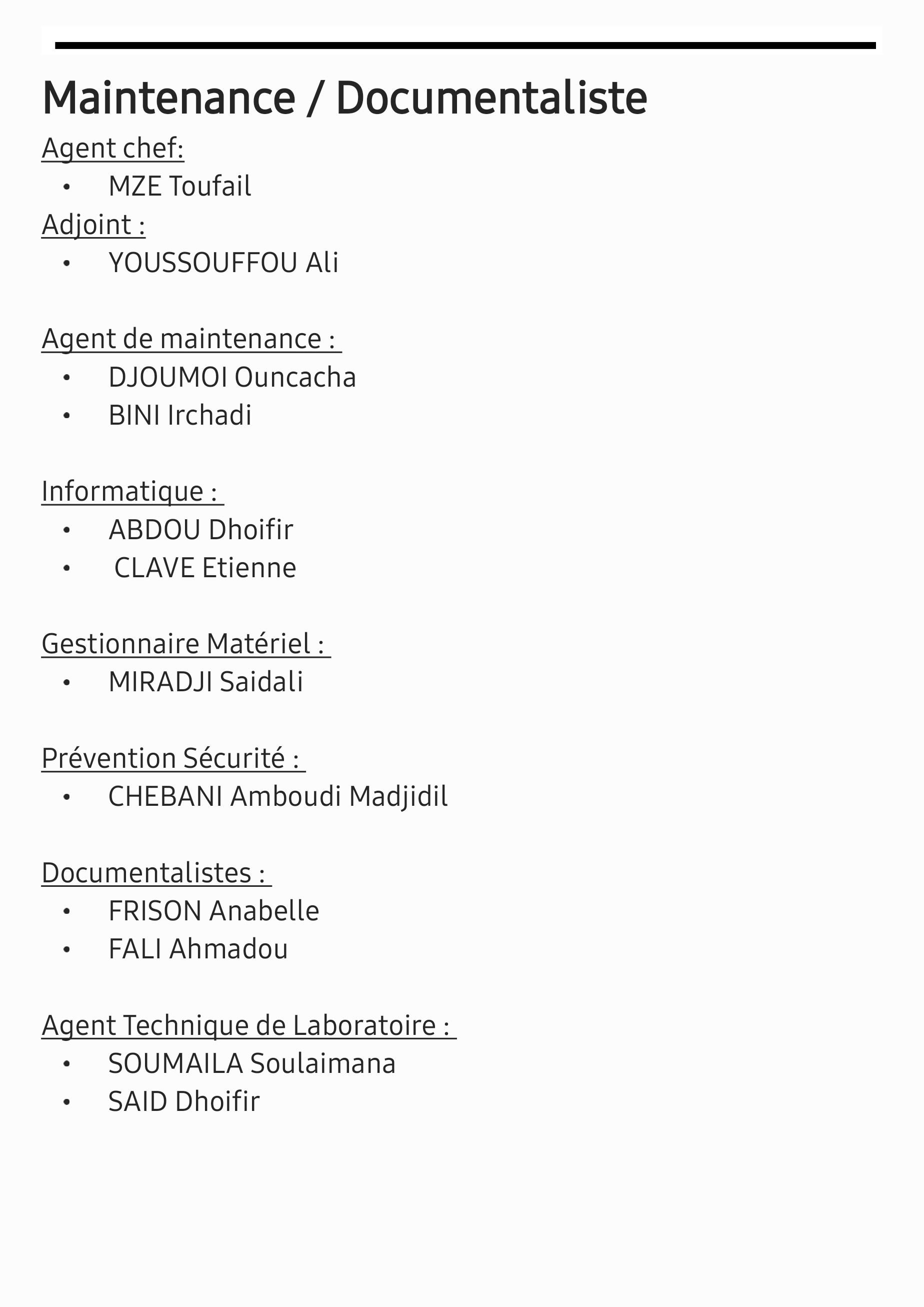- Agent de maintenance : DJOUMOI Ouncacha, BINI Irchadi